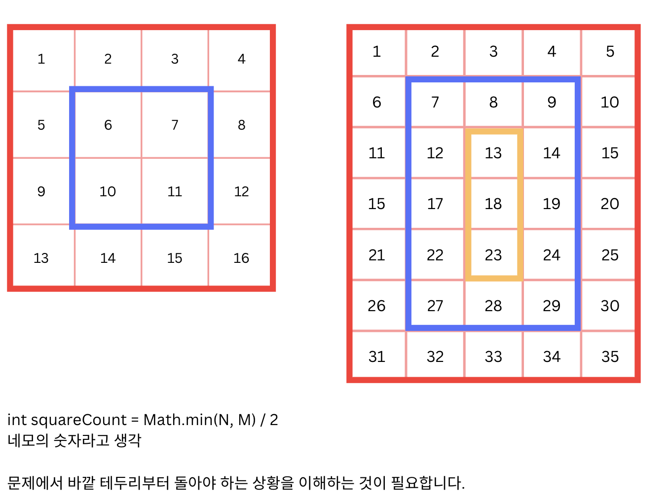 크기가 N×M인 배열이 있을 때, 배열을 돌려보려고 한다. 배열은 다음과 같이 반시계 방향으로 돌려야 한다. A[1][1] ← A[1][2] ← A[1][3] ← A[1][4] ← A[1][5] ↓ ↑ A[2][1] A[2][2] ← A[2][3] ← A[2][4] A[2][5]