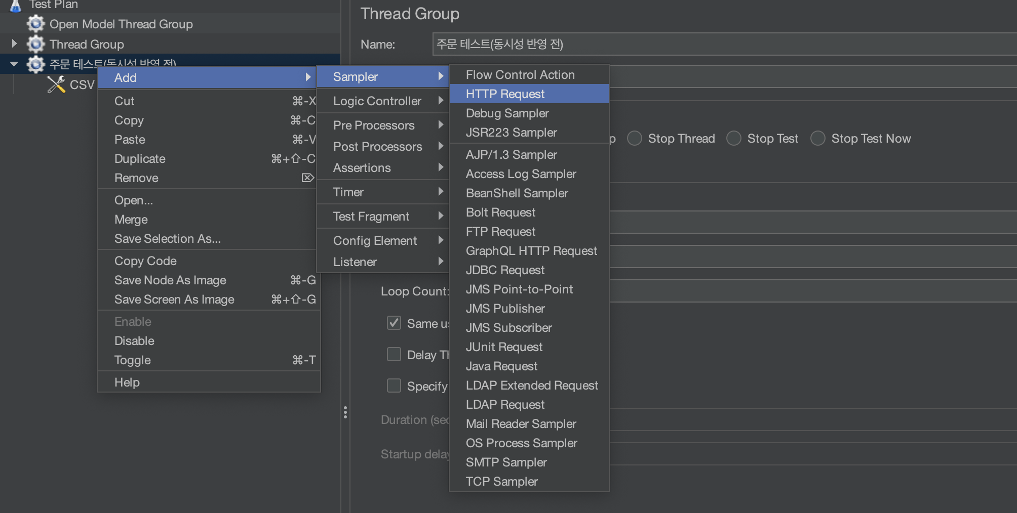 Add → Sampler → HttpRequest 를 만들어 줍니다.