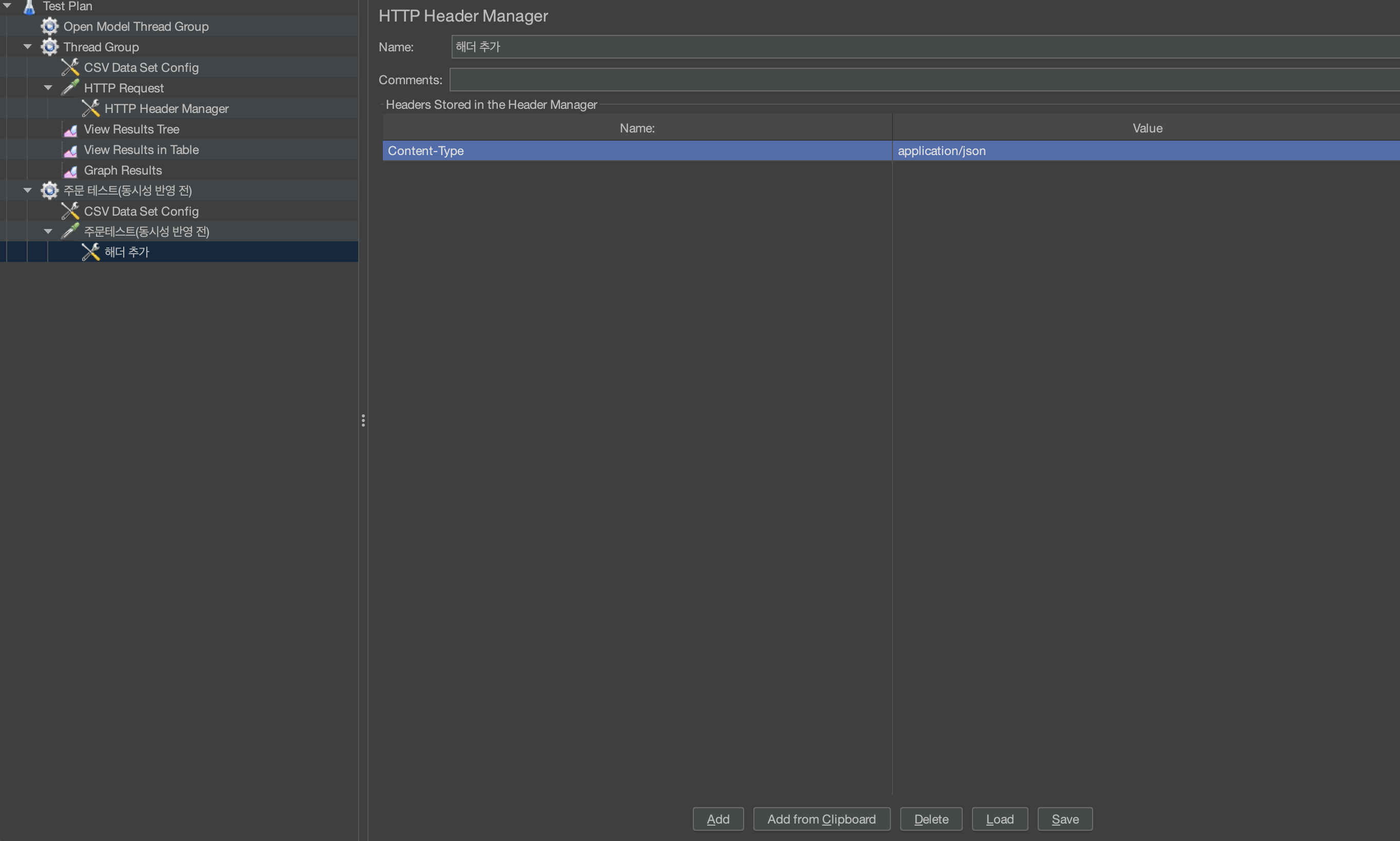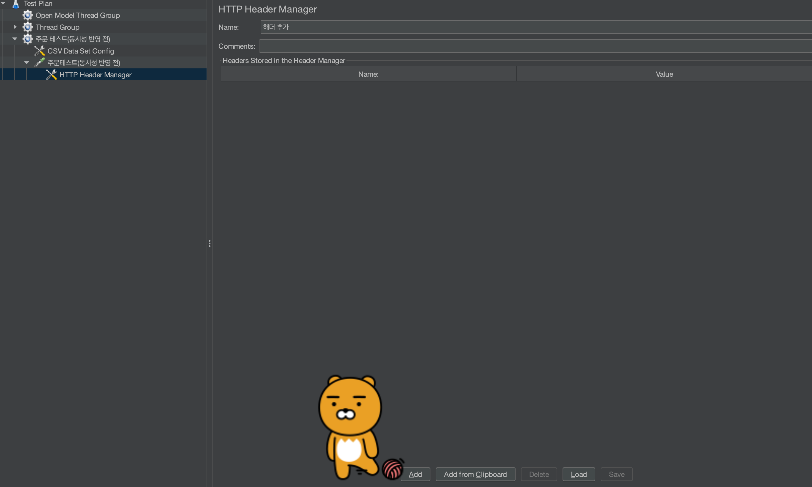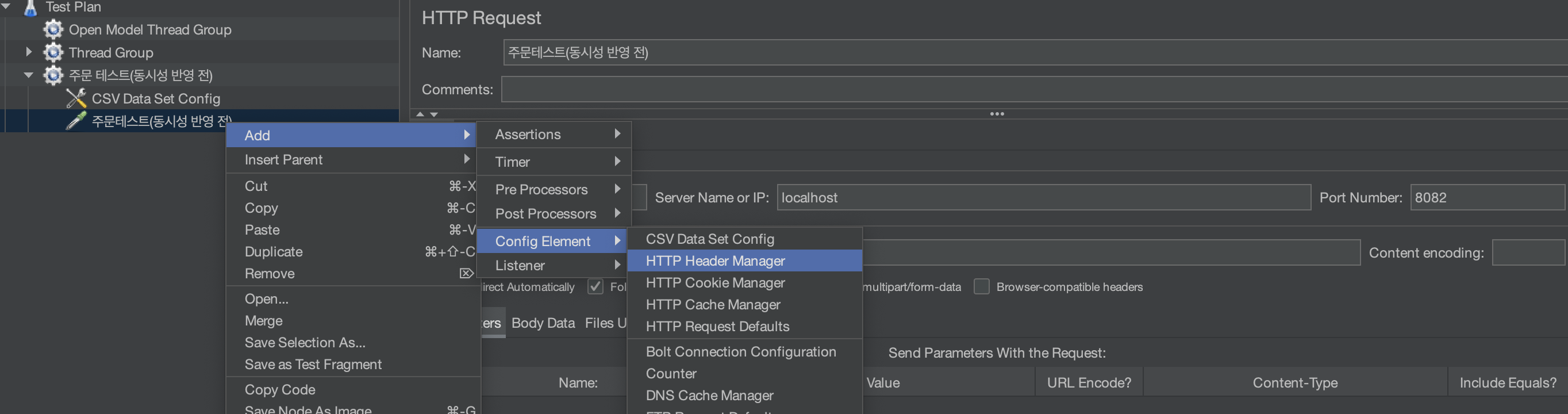 만든 request(우클릭) → Add → Config Element → Http Header Manager 로 들어갑니다.