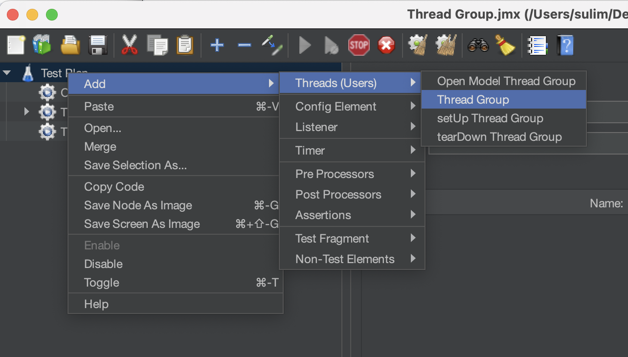 - Test Plan (우클릭) → Add → Threads(Users)→ Thread Group 을 만듭니다