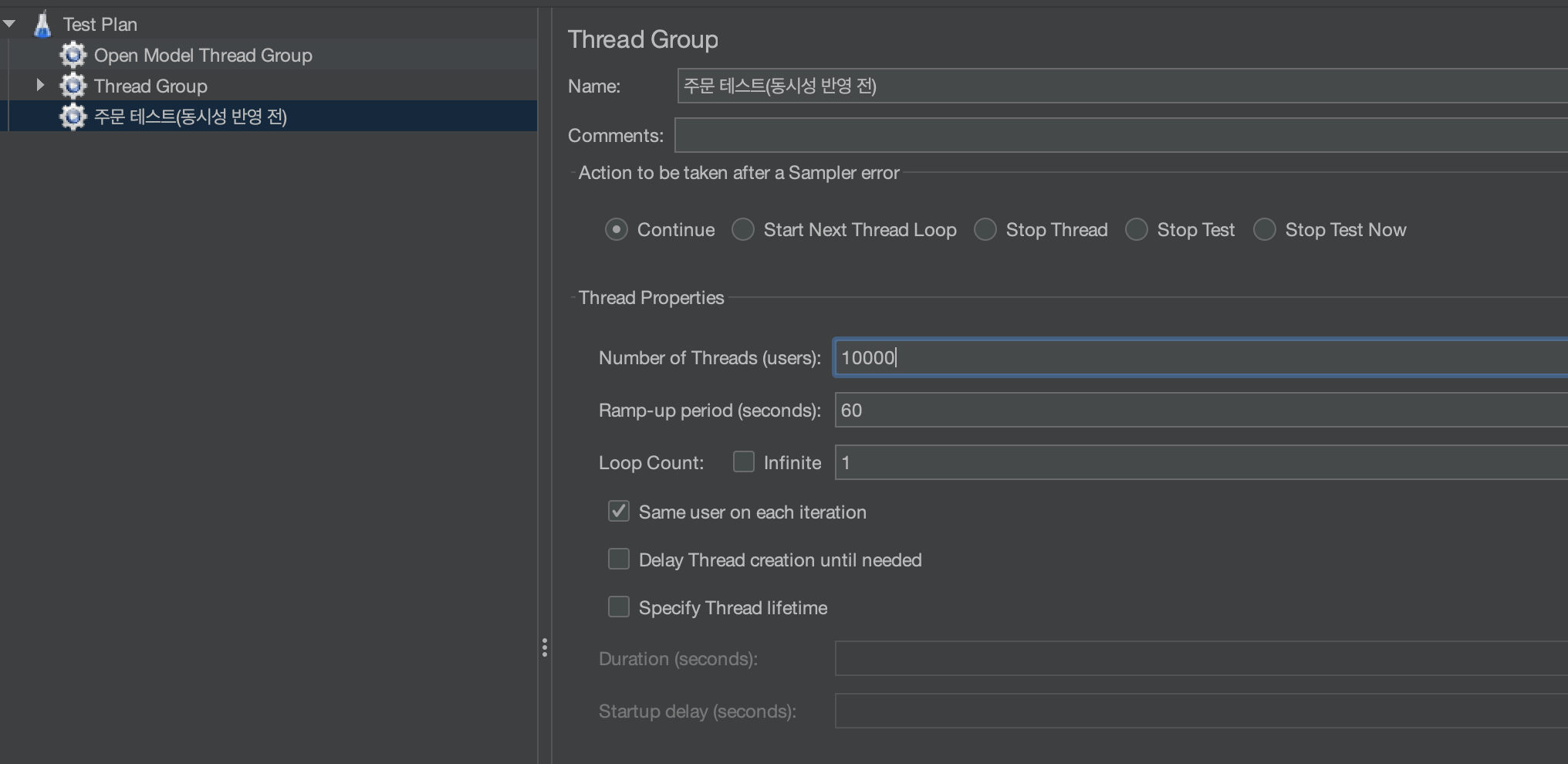 - Number of Threads(동시에 작업을 수행할 사용자 수, 몇명 들어올 예정일까요?) : 10000명의 사용자