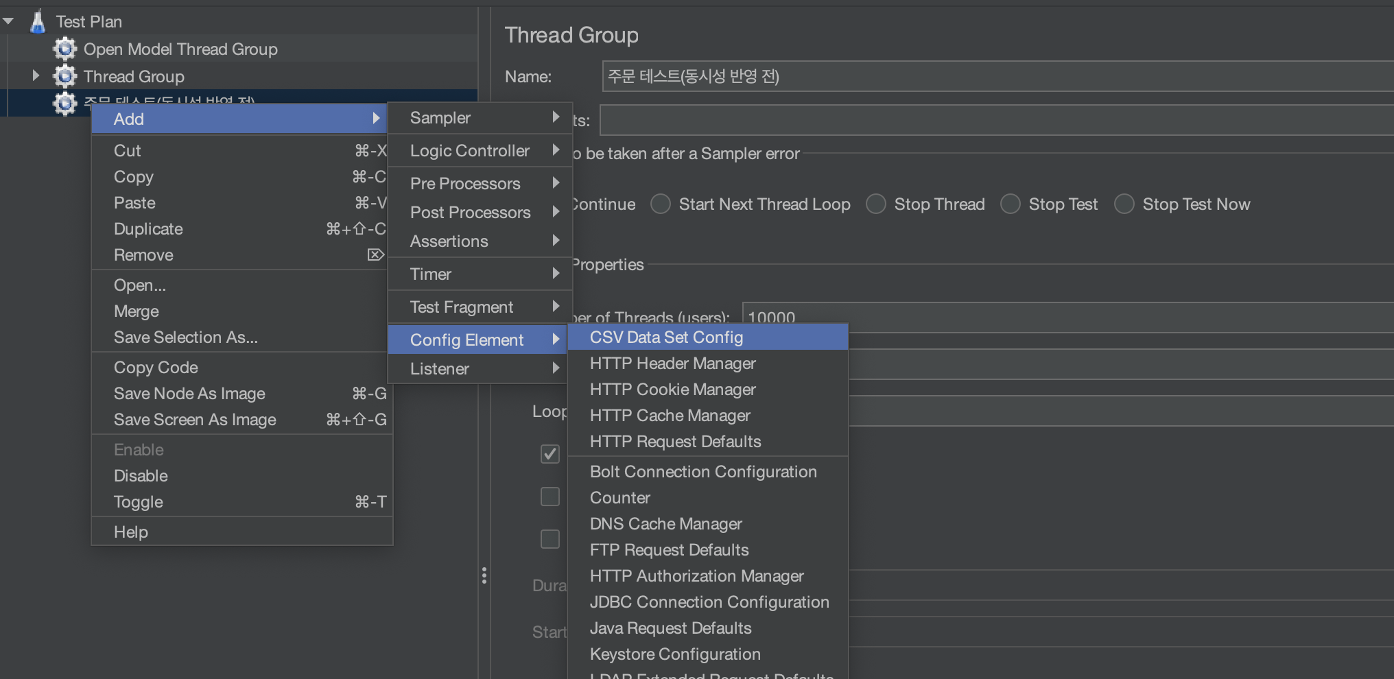 - Test Plan (우클릭) → Add → ConfigElement→ CSV DataSetConfig 을 만듭니다